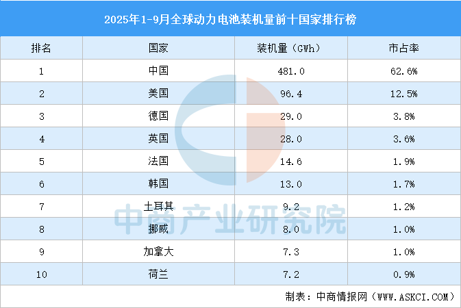其中,中國(guó)動(dòng)力電池裝機(jī)量約481.0GWh,市占率62.6%。美國(guó)緊隨其后,動(dòng)力電池裝機(jī)量約96.4GWh,市占率12.5%。德國(guó)、英國(guó)動(dòng)力電池裝機(jī)量超20GWh,市占率分別為3.8%、3.6%。法國(guó)、韓國(guó)、土耳其、挪威、加拿大、荷蘭進(jìn)入前十,依次排名第4-10名。