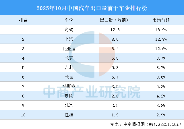 中商情報(bào)網(wǎng)訊:10月,汽車出口66.6萬(wàn)輛,環(huán)比增長(zhǎng)2.1%,同比增長(zhǎng)22.9%。其中,奇瑞出口量達(dá)12.6萬(wàn)輛,同比增長(zhǎng)13%,市場(chǎng)份額19%。上汽排名第二,出口量達(dá)8.6萬(wàn)輛,市場(chǎng)份額12.9%。比亞迪位居第三,出口達(dá)8.4萬(wàn)輛,市場(chǎng)份額12.6%。長(zhǎng)安、吉利、長(zhǎng)城、特斯拉、東風(fēng)、北汽、江淮進(jìn)入前十,依次排名第4-10名。