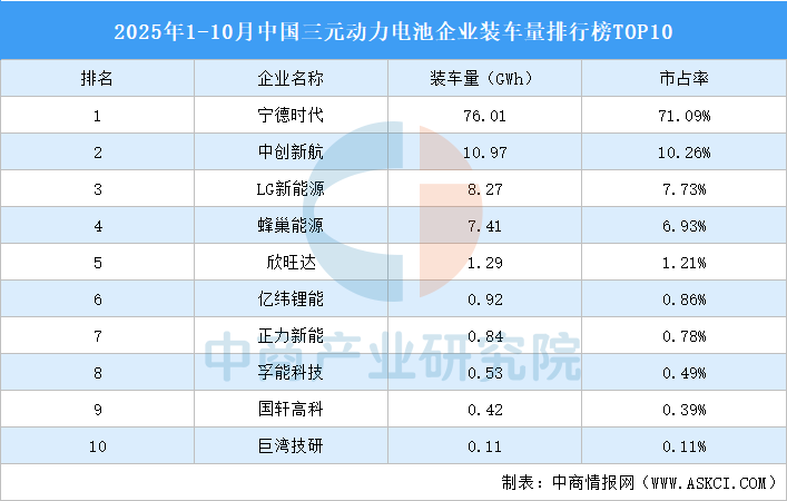 2025年10月中國三元動力電池企業(yè)裝車量排行榜TOP10(附榜單)