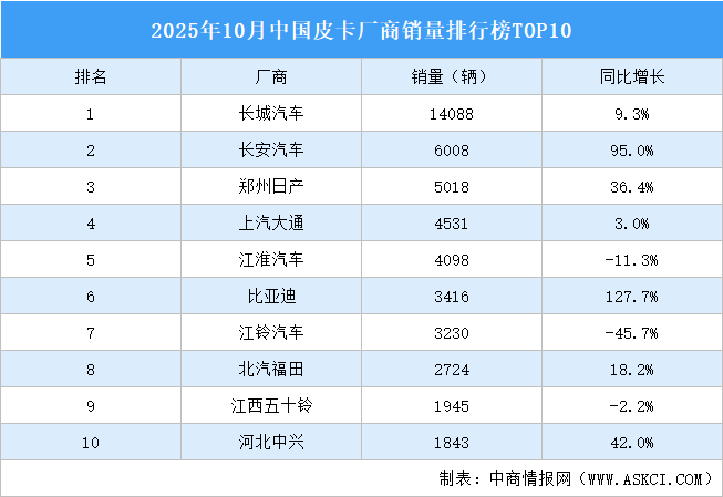 中商情報網(wǎng)訊:2025年10月,皮卡市場銷售為4.8萬輛,同比增長12%,環(huán)比增長5.5%,處于近5年的中高位水平。TOP10皮卡廠商銷量合計4.69萬輛。