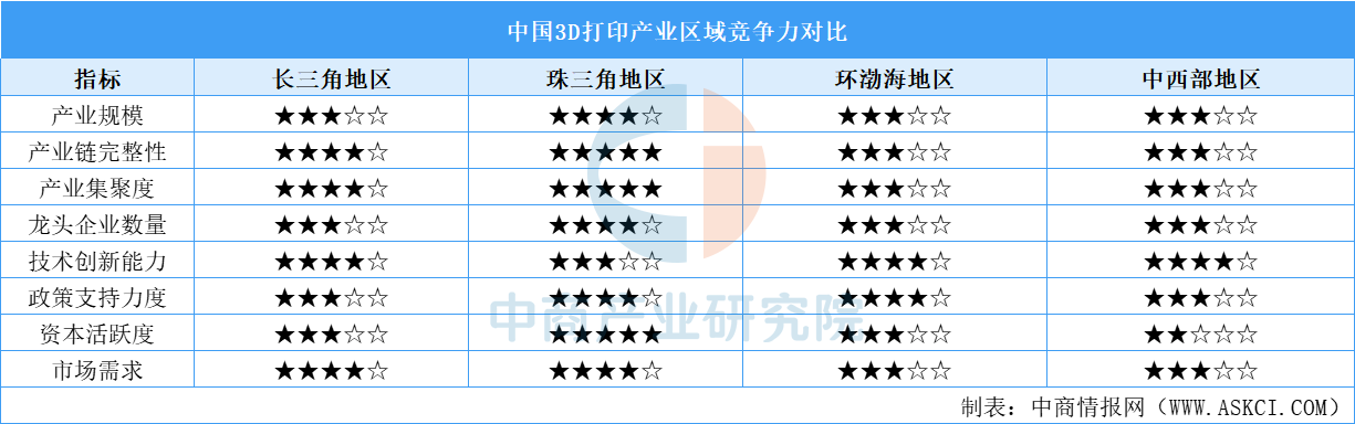 3D打印區(qū)域競爭力對比