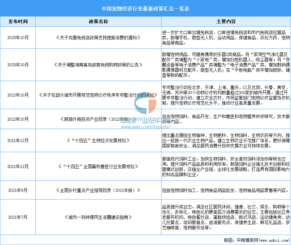 為更好激活寵物經(jīng)濟(jì)消費(fèi)新動能,推進(jìn)寵物相關(guān)行業(yè)規(guī)范健康發(fā)展,我國政府相關(guān)部門出臺了《關(guān)于完善免稅店政策支持提振消費(fèi)的通知》《關(guān)于在部分城市開展規(guī)范寵物診療秩序?qū)m?xiàng)整治行動的通知》《全國鄉(xiāng)村重點(diǎn)產(chǎn)業(yè)指導(dǎo)目錄(2021年版)》等一系列政策措施,為寵物經(jīng)濟(jì)產(chǎn)業(yè)的發(fā)展提供了有力的政策保障。