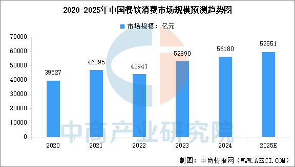 隨著消費者外食習慣普及及外賣服務(wù)滲透率提升,餐飲市場總體保持穩(wěn)步擴張態(tài)勢。中商產(chǎn)業(yè)研究院發(fā)布的《2025-2030年中國餐飲行業(yè)市場調(diào)查及研究預(yù)測報告》顯示,中國餐飲消費市場規(guī)模由2020年的39527億元增長至2024年的56180億元,復(fù)合年均增長率達9.2%。中商產(chǎn)業(yè)研究院分析師預(yù)測,2025年中國餐飲消費市場規(guī)模將達到59551億元。