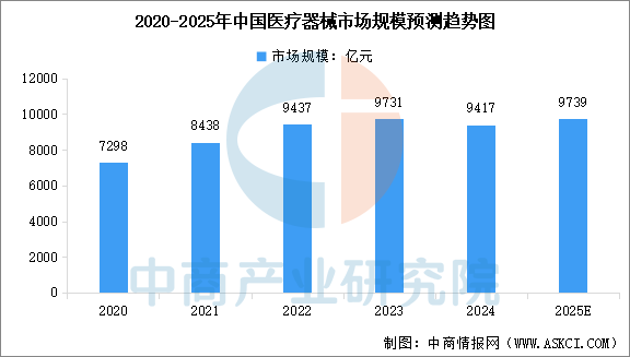 得益于國內(nèi)基層醫(yī)療基礎設施的擴張、慢性病管理解決方案的普及以及政府促進器械更新及自主創(chuàng)新的支持性政策,中國醫(yī)療器械市場規(guī)模不斷擴大,成為全球第二大醫(yī)療器械市場。中商產(chǎn)業(yè)研究院發(fā)布的《2025-2030年中國醫(yī)療器械行業(yè)調(diào)查及發(fā)展前景研究報告》顯示,2020年至2024年中國醫(yī)療器械市場規(guī)模從7298億元增長至9417億元,期內(nèi)年均復合增長率為6.6%。中商產(chǎn)業(yè)研究院分析師預測,2025年中國醫(yī)療器械市場規(guī)模將達到9739億元。