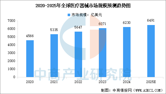 中商情報網(wǎng)訊:隨著基本醫(yī)療保健需求增長和技術持續(xù)進步,全球醫(yī)療器械市場保持穩(wěn)定增長勢頭。中商產(chǎn)業(yè)研究院發(fā)布的《2025-2030年中國醫(yī)療器械行業(yè)調(diào)查及發(fā)展前景研究報告》顯示,全球醫(yī)療器械市場規(guī)模從2020年的4566億美元增長至2024年的6230億美元,期內(nèi)年均復合增長率為8.1%。中商產(chǎn)業(yè)研究院分析師預測,2025年全球醫(yī)療器械市場規(guī)模將達到6491億美元。