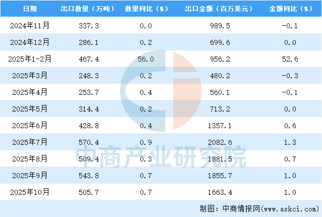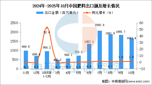 2025年10月中國肥料出口量及金額增長情況