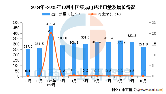 中商情報(bào)網(wǎng)訊:據(jù)中商產(chǎn)業(yè)研究院數(shù)據(jù)庫顯示,2025年10月中國集成電路出口量274.8億個(gè),同比增長0.3%;1-10月中國集成電路出口量2927億個(gè),同比增長19.2%。