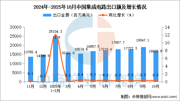 從金額方面來看,2025年10月中國集成電路出口金額16698.9百萬美元,同比增長0.3%;1-10月中國集成電路出口金額161685.3百萬美元,同比增長23.7%。