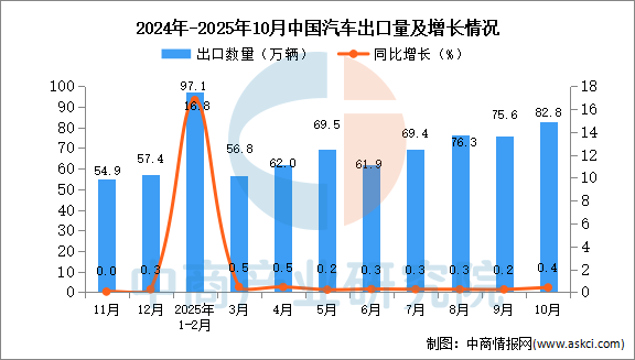 2025年10月中國汽車(包括底盤)出口量及金額增長情況