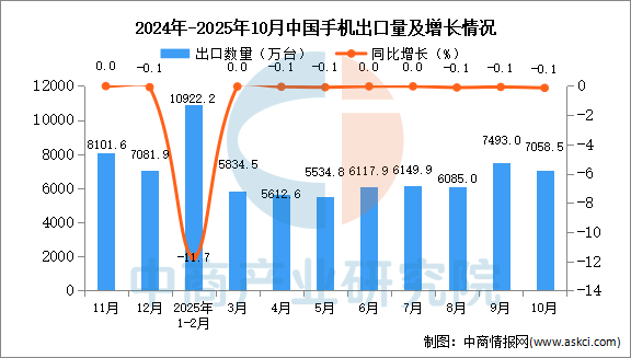 中商情報(bào)網(wǎng)訊:據(jù)中商產(chǎn)業(yè)研究院數(shù)據(jù)庫顯示,2025年10月中國手機(jī)出口量7058.5萬臺(tái),同比下降0.1%;1-10月中國手機(jī)出口量60783.2萬臺(tái),同比下降8.2%。