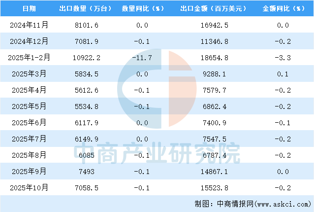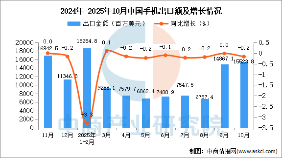 從金額方面來看,2025年10月中國手機(jī)出口金額15523.8百萬美元,同比下降0.2%;1-10月中國手機(jī)出口金額94400.3百萬美元,同比下降11%。